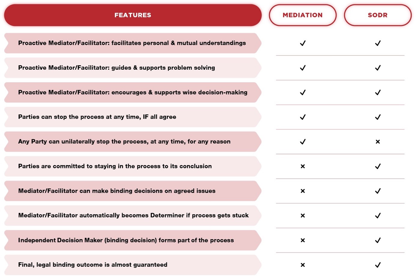 In rare cases Parties can’t reach agreement. Then the Facilitator makes a binding decision that’s legally enforceable as a contract. This process guarantees a legally binding outcome within six weeks of commencement.