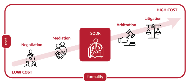 SODR combines the best features of Mediation and Arbitration and avoids their downsides. It delivers speed, flexibility, guaranteed finality, and closure for a relatively modest, fixed fee. Experts and lawyers can participate, but are not required.